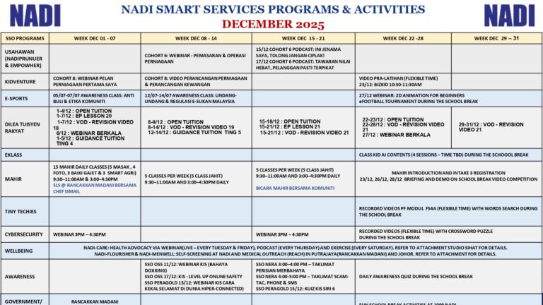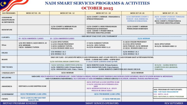 TARIKH HARI MASA PROGRAM/AKTIVITI JUMLAH PESERTA 02/09/2025 ISNIN 10:30 AM WEBINAR KESEJAHTERAAN KENDIRI – JOM KENALI NARSIS DAN MANGSA PALSU 1 02/09/2025 ISNIN 3:30 – 4:30 PM OPEN TUITION (ENGLISH) 4 04/09/2025 KHAMIS 9:30 – 10:00 AM MAHIR PERTANIAN PINTAR […]