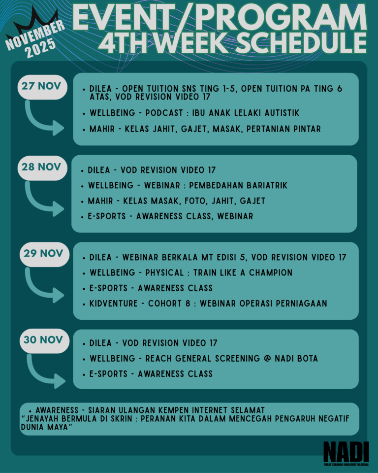 Program Tarikh Masa Penglibatan/ Peserta Aktiviti/Modul NADI x Pembelajaran Sepanjang Hayat (DiLea Live Class) di NADI Taman Lendu Bakti Gambar 1 Gambar 2 Gambar 3 Gambar 4 Gambar 5 5 Julai 2025 (Sabtu) 2:15 – 4:30 petang Syafika Aleeya (Pelajar […]